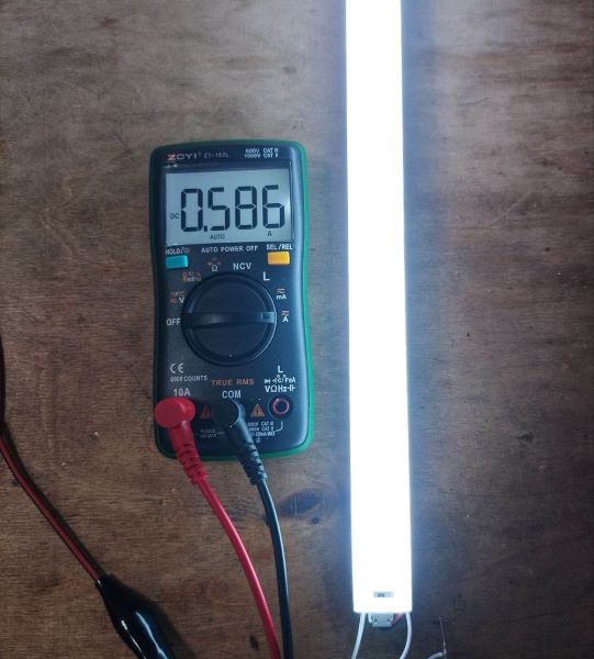 Este paso es fundamental conocer y para ello nos vamos a auxiliar de una fuente que entregue el voltaje con que opera el aparato y un multímetro en modo amperímetro conectado en serie en la linea positiva con el equipo, para este ejemplo vamos a tomar una lampara recargable.